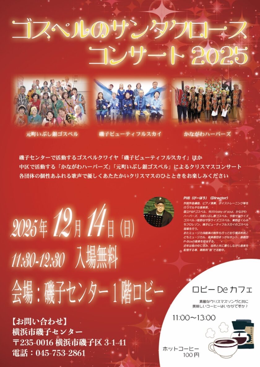 - 磯子センターで活動するゴスペルクワイア「磯子ビューティフルスカイ」・中区で活動する「かながわハーバーズ」「元町いぶし銀ゴスペル」によるクリスマスコンサートです。